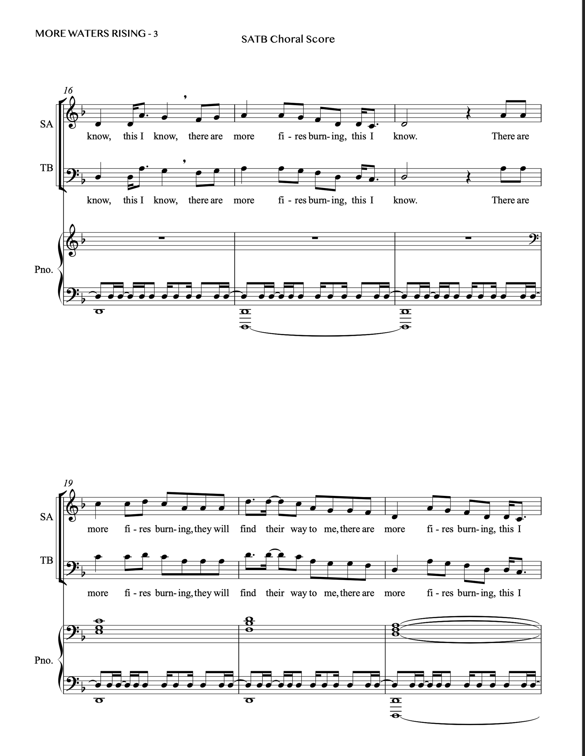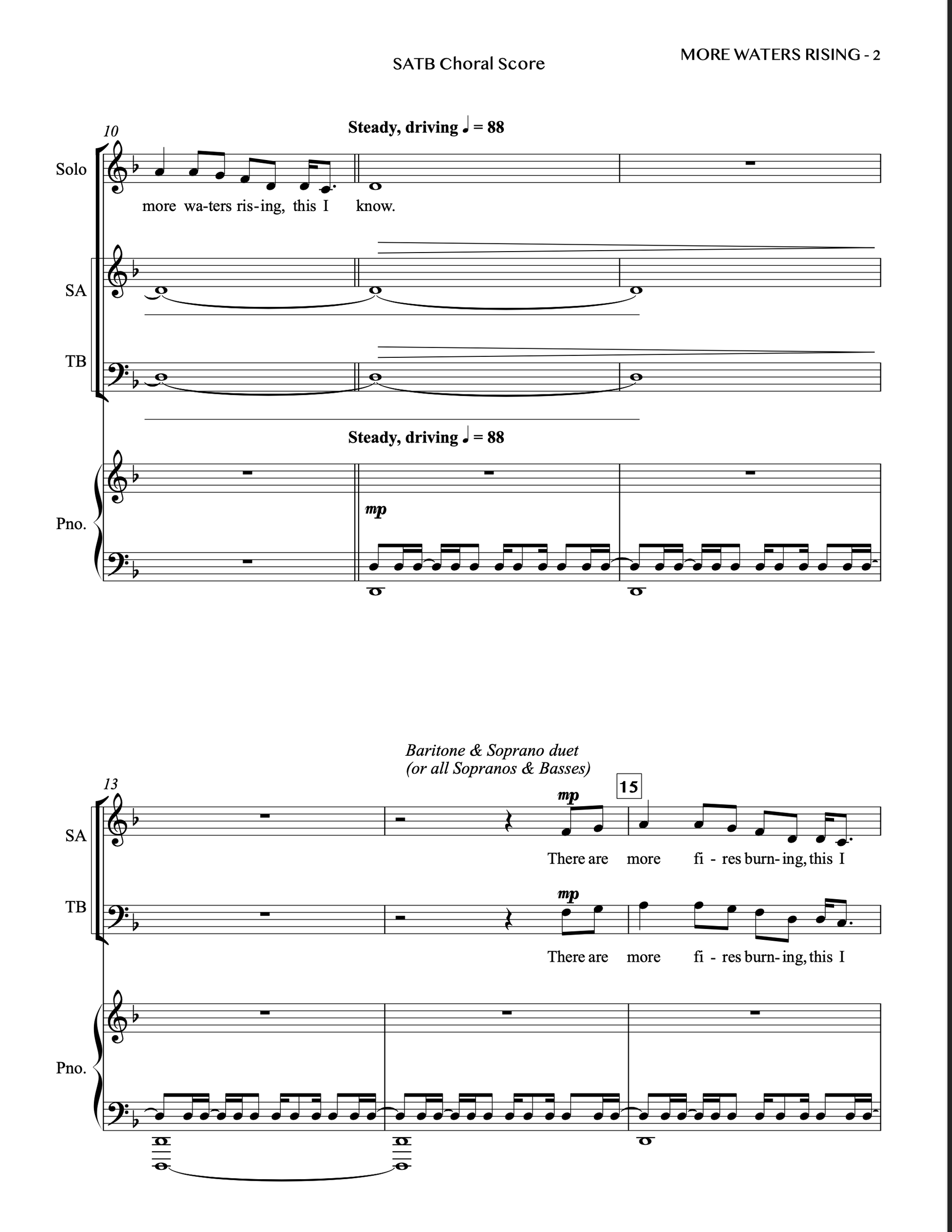 MORE WATERS RISING is a powerful original song by Saro Lynch-Thomason (b. 1986) which draws on styles and arrangements from traditional African-American church and work songs. It is a reflection of the ecological and social changes sweeping our world right now. This stirring arrangement, with piano and optional percussion, minds us that we do indeed possess the communal strength and patience to make it through these challenging times and emerge on the other side.